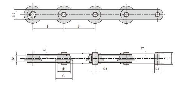 鏈號 節(jié)距 內(nèi)節(jié)內(nèi)寬 滾子直徑 銷軸直徑 銷軸長度 鏈板高度 鏈板厚度 抗拉強度 平均抗拉強度 每米長重