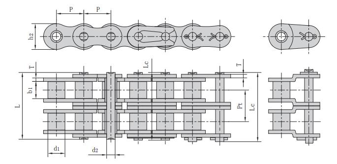 鏈條型號 節距 滾子直徑 內節內寬 銷軸直徑 銷軸長度 內鏈板高度 鏈板厚度 排距 抗拉強度 每米重量