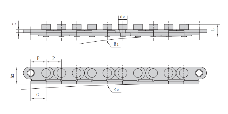 鏈條型號 節距 銷軸直徑 銷軸長度 鏈板尺寸 側彎半徑 每米長重