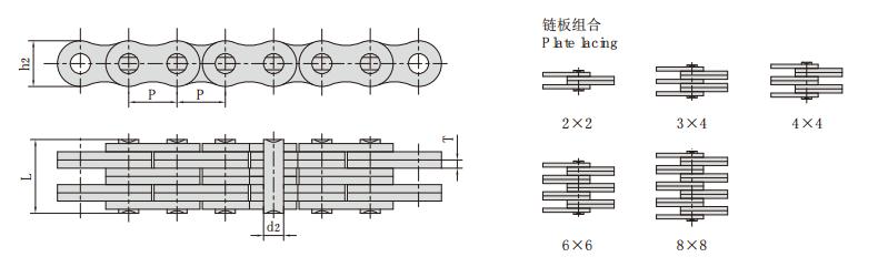 鏈號 節(jié)距 鏈板組合 鏈板高度 鏈板厚度 銷軸直徑 銷軸長度 抗拉強度 平均抗拉強度 每米重量