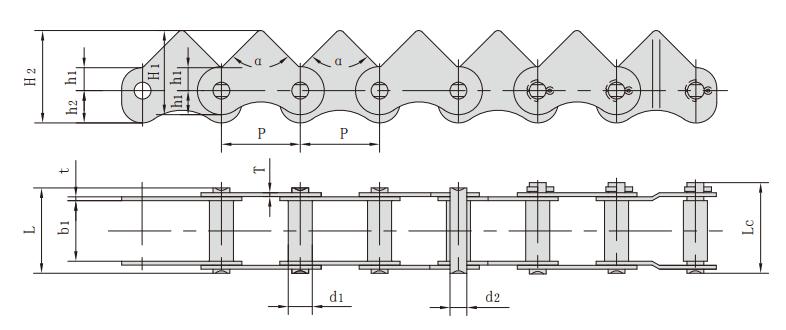 鏈號(hào) 節(jié)距 滾子直徑 內(nèi)節(jié)內(nèi)寬 銷(xiāo)軸直徑 銷(xiāo)軸長(zhǎng)度 齒形角 鏈板厚度 鏈板尺寸 抗拉強(qiáng)度 平均抗拉強(qiáng)度