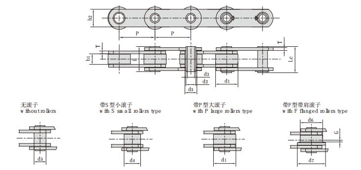 鏈號(hào) 節(jié)距 滾子尺寸 內(nèi)節(jié)內(nèi)寬 銷軸直徑 套筒直徑 銷軸長度 鏈板厚度 鏈板高度 抗拉強(qiáng)度