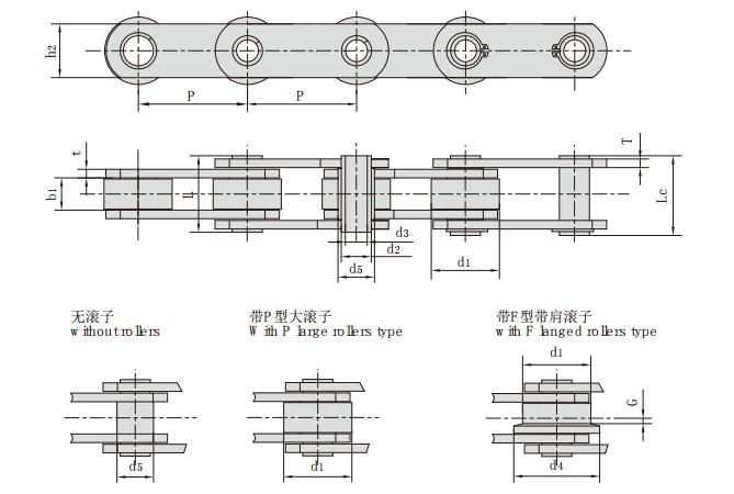 鏈號 節(jié)距 滾子尺寸 套筒直徑 內(nèi)節(jié)內(nèi)寬 銷軸直徑 鏈板高度 銷軸長度 鏈板厚度 抗拉強度
