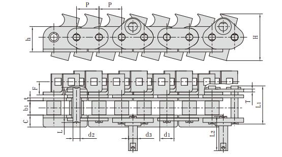 鏈條型號(hào) 節(jié)距 滾子直徑 內(nèi)節(jié)內(nèi)寬 銷軸直徑 銷軸長(zhǎng)度 鏈板尺寸 裝配尺寸 抗拉強(qiáng)度